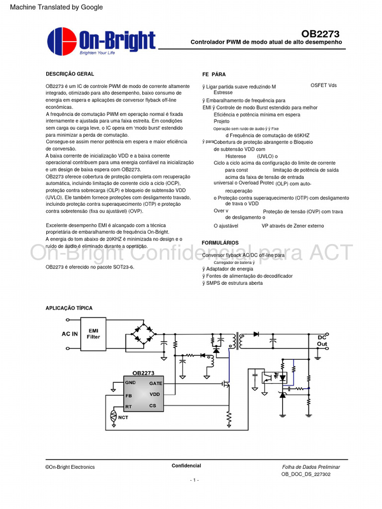 OB2273 é um IC de controle PWM de modo de corrente altamente ÿ Ligar partida suave reduzindo M OSFET Vds