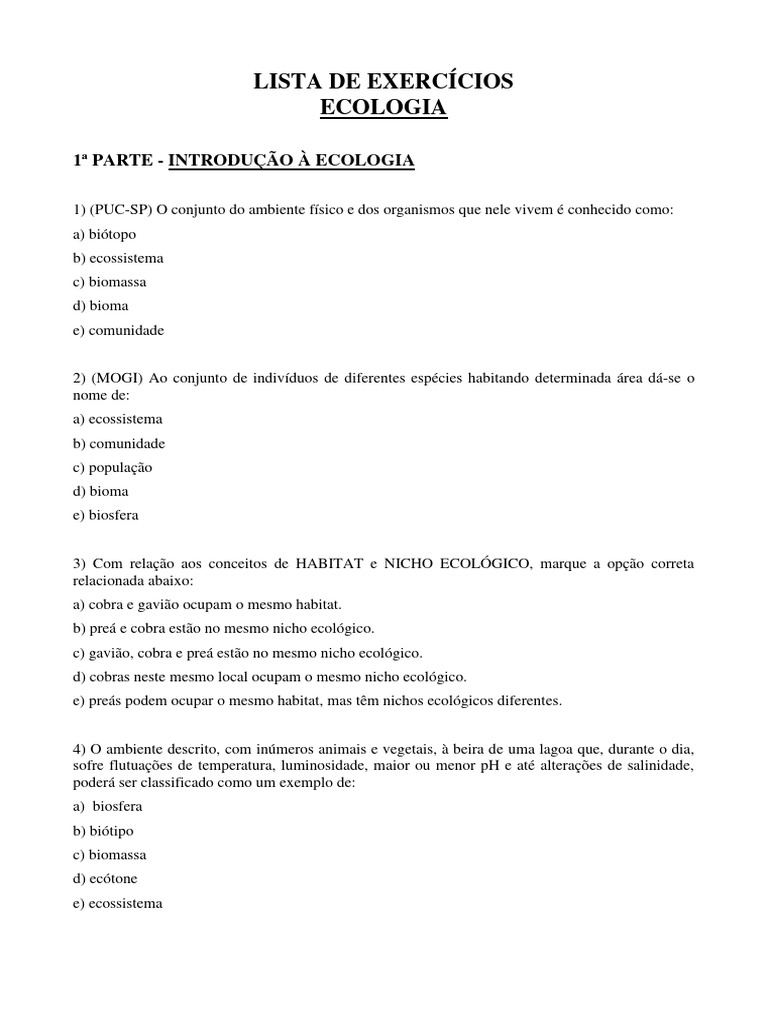 1) (PUC-SP) O conjunto do ambiente físico e dos organismos que nele vivem é conhecido como:
