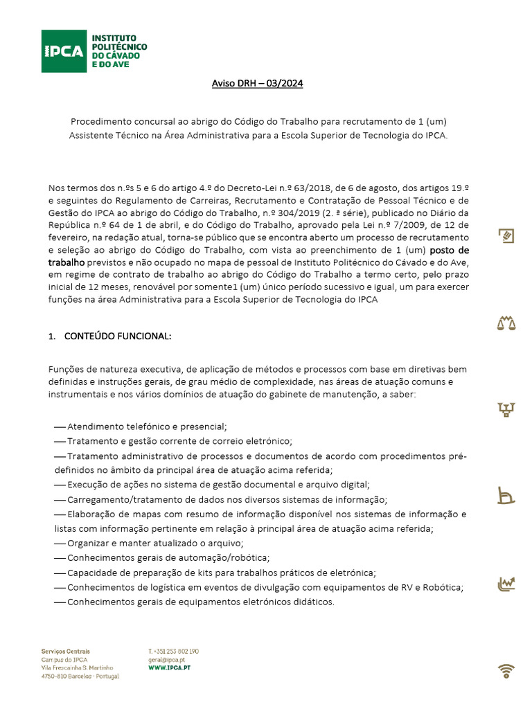Recrutamento e Contratação de Pessoal Técnico e de Gestão do IPCA e no Código do Trabalho.