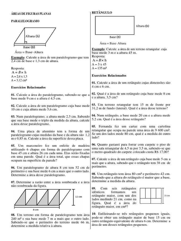 03. Num paralelogramo, a altura mede 2,5 cm. Sabendo 04. Num retângulo, a base mede 20 cm e a altura mede
