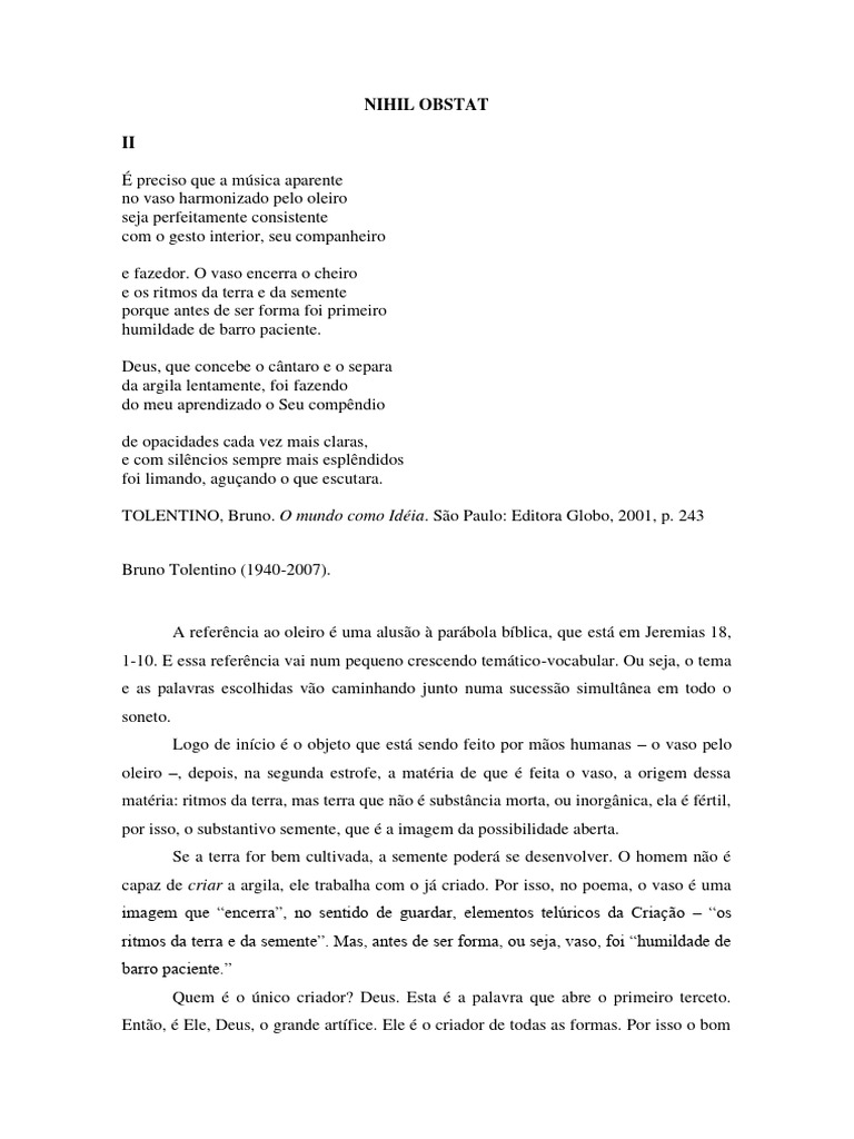 oleiro –, depois, na segunda estrofe, a matéria de que é feita o vaso, a origem dessa