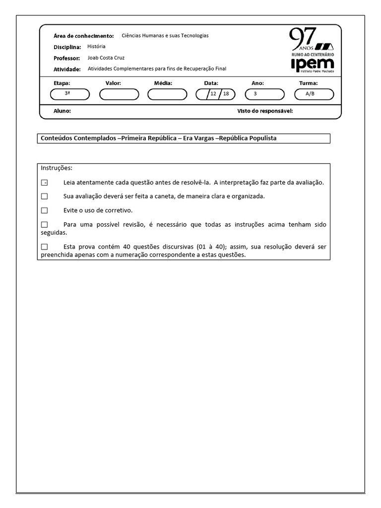 Sua avaliação deverá ser feita a caneta, de maneira clara e organizada.