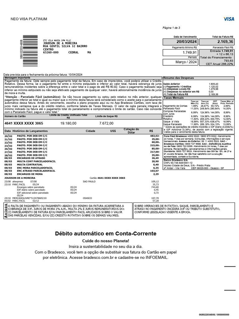 de mora e multa. (=) Total da Fatura R$ 2.169,36