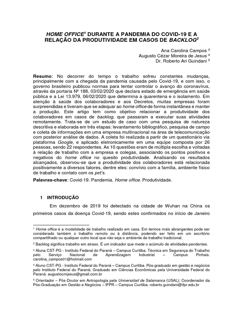 Palavras-chave: Covid-19. Pandemia. Home office. Produtividade.