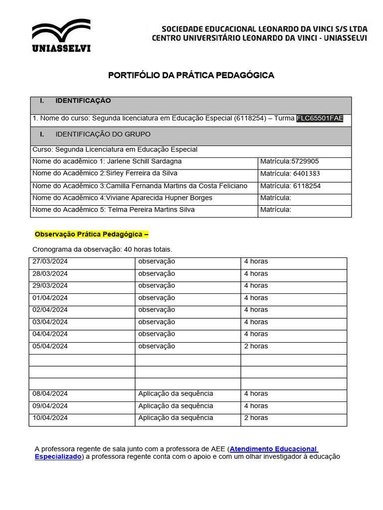 Observação Prática Pedagógica –