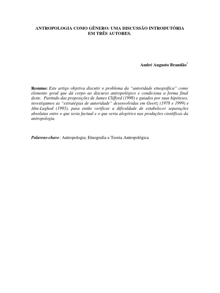 Resumo: Este artigo objetiva discutir o problema da autoridade etnogrfica como elemento geral que d corpo ao discurso antropolgico e condiciona a forma final deste. Partindo das proposies de James Clifford (1998) e guiados por suas hipteses, investigamos as estratgias de autoridade desenvolvidas em Geertz (1978 e 1999) e Abu-Lughod (1993), para ento verificar a dificuldade de estabelecer separaes absolutas entre o que seria factual e o que seria alegrico nas produes cientficas da antropologia.
