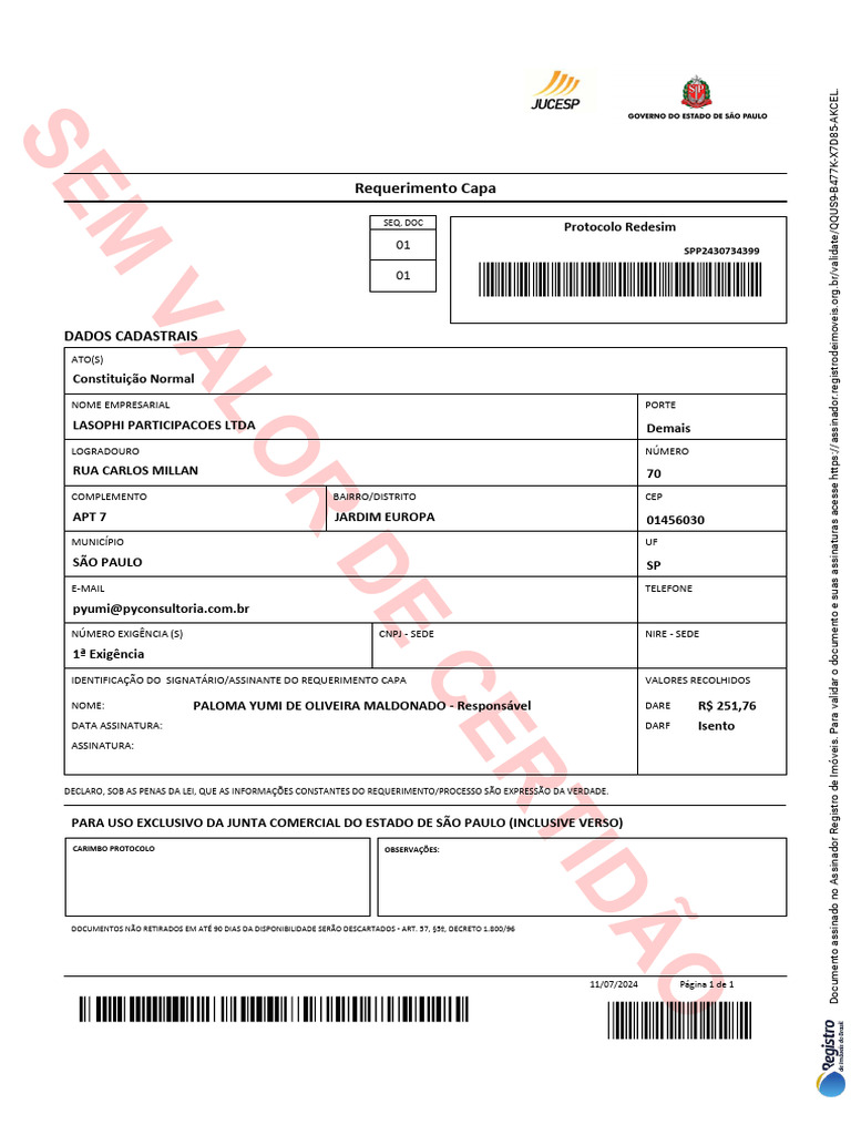 sob o número SPP2430734399 em 11/07/2024, encontra-se registrado na Jucesp, sob o NIRE da matriz