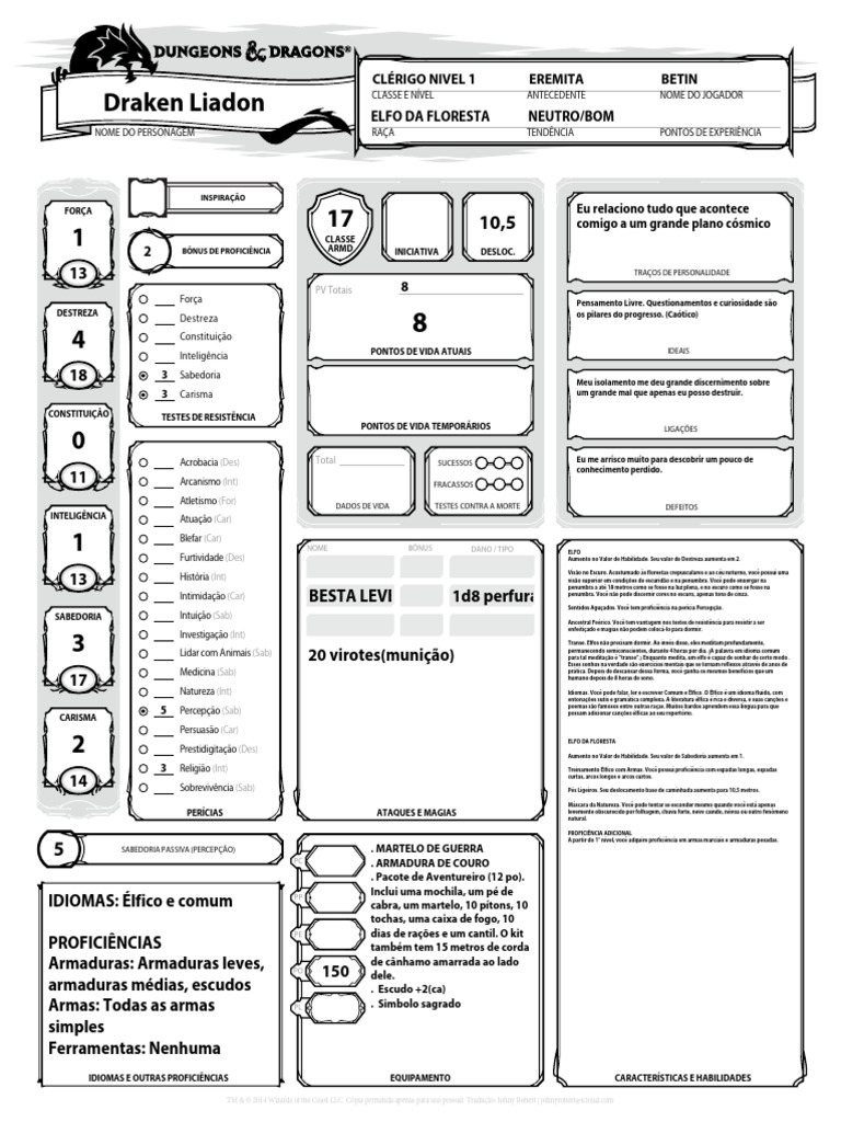 NOME DO PERSONAGEM RAÇA TENDÊNCIA PONTOS DE EXPERIÊNCIA