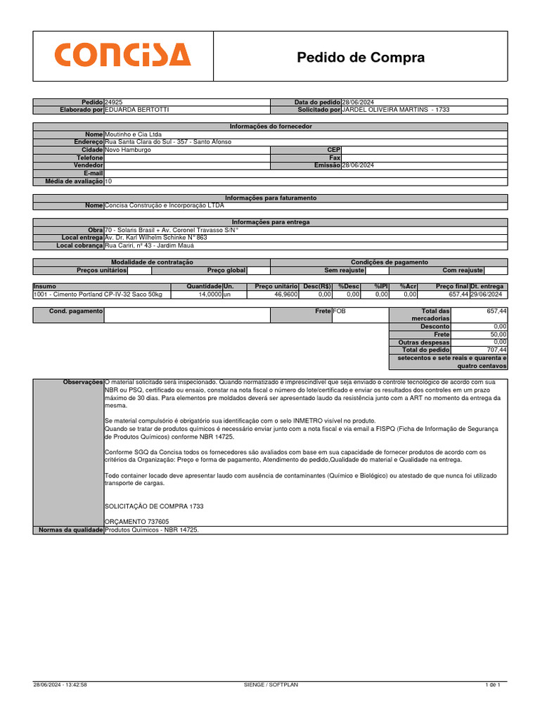 1001 - Cimento Portland CP-IV-32 Saco 50kg 14,0000 un 46,9600 0,00 0,00 0,00 0,00 657,44 29/06/2024