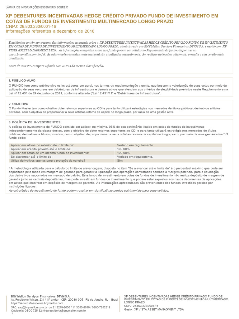 Esta lâmina contém um resumo das informações essenciais sobre o XP DEBENTURES INCENTIVADAS HEDGE CRÉDITO PRIVADO FUNDO DE INVESTIMENTO