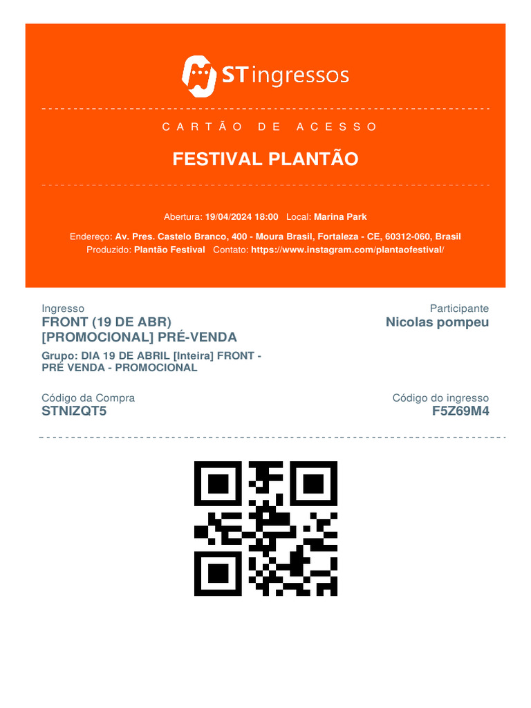 Você está recebendo apenas um ingresso da compra F5Z69M4. Este ingresso