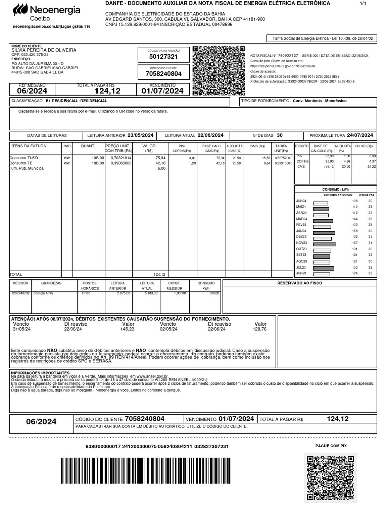 CÓDIGO DO CLIENTE 7058240804 VENCIMENTO 01/07/2024 TOTAL A PAGAR R$ 124,12