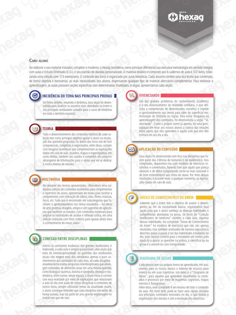 Ao elaborar o seu material inovador, completo e moderno, o Hexag considerou como principal diferencial sua exclusiva metodologia em período integral,