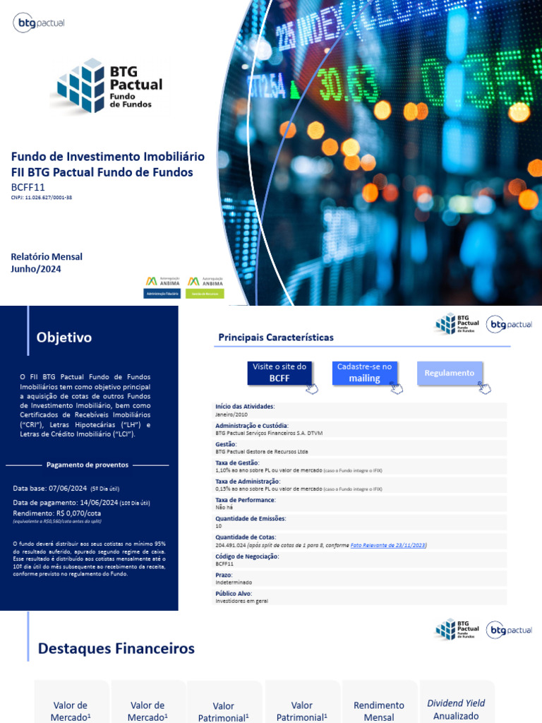 Em junho/24, o BCFF pagou R$ 0,070/cota aos seus investidores, que representa um dividend yield de 9,67% ao ano com base na cota
