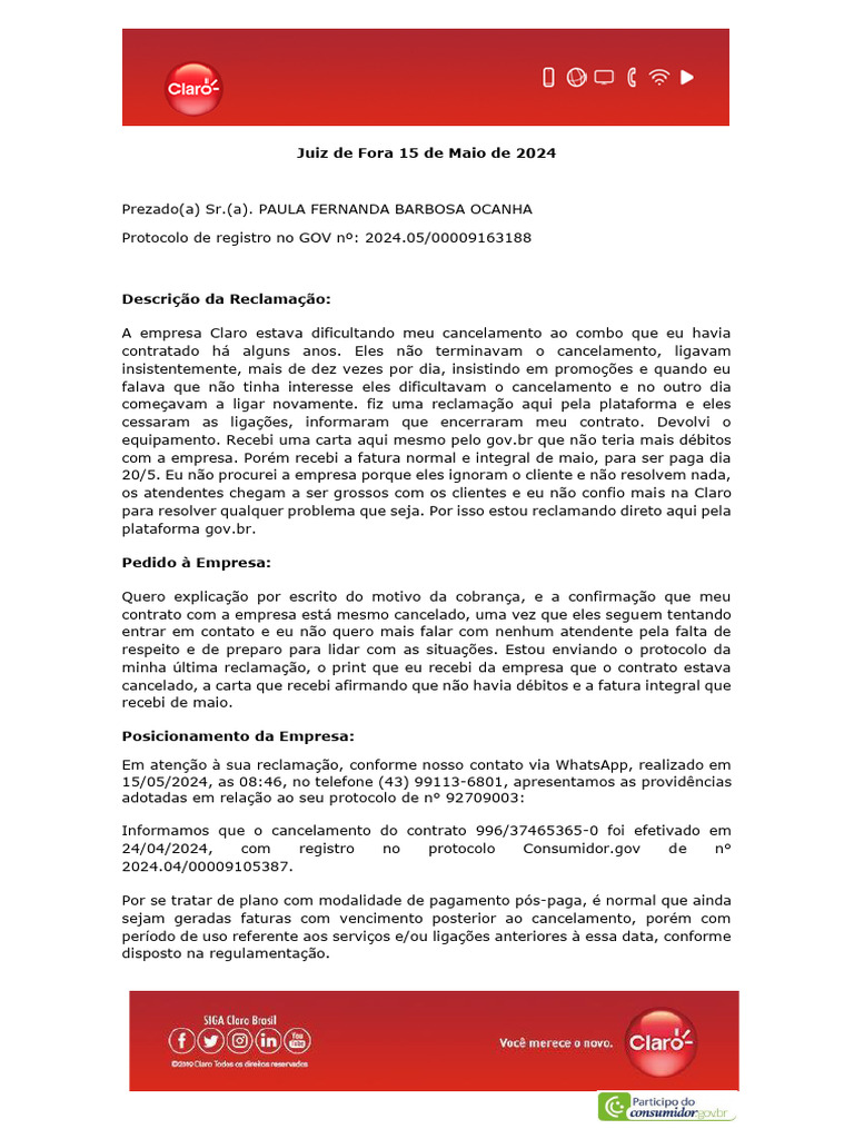 com a empresa. Porém recebi a fatura normal e integral de maio, para ser paga dia