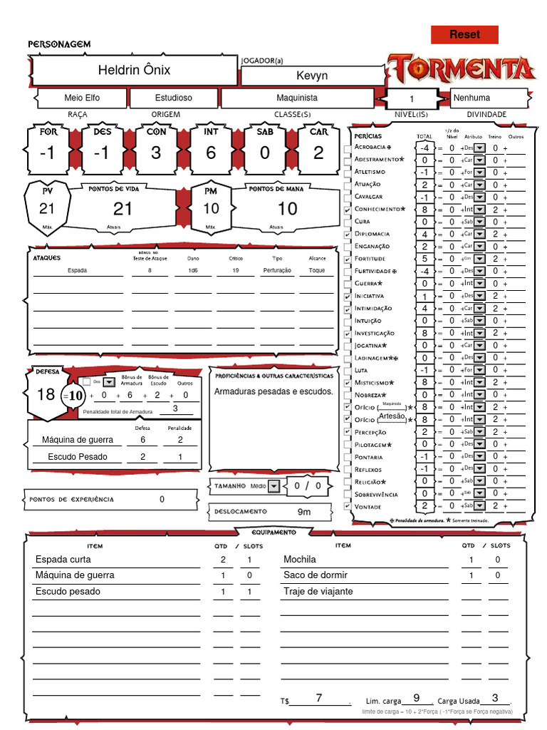 18 =10 0 6 2 0 Armaduras pesadas e escudos. 0 0 Int 0