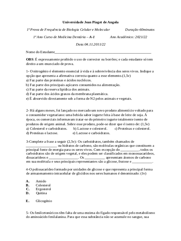 1ª Prova de Frequência de Biologia Celular e Molecular Duração-60minutos