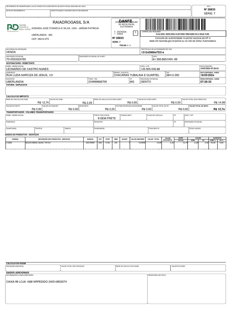 CEP: 38414-073 Nº 28833 Consulta de autenticidade no portal nacional da NF-e