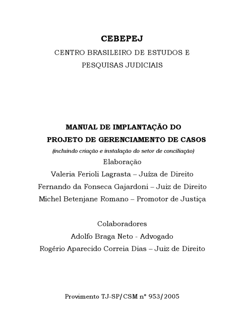 O Projeto de Gerenciamento de Casos surgiu de estudos realizados por juzes, promotores, advogados e socilogos junto ao Centro Brasileiro de Estudos e Pesquisas Judiciais (CEBEPEJ), sob a orientao do Professor Kazuo Watanabe e do Desembargador Caetano Lagrasta Neto, e foi implantado como piloto, a partir de 01 de julho de 2004, na 2 Vara da Comarca de Serra Negra, da qual era titular a Dra. Valeria Ferioli Lagrasta, e na Vara nica da Comarca de Patrocnio Paulista, da qual titular o Dr. Fernando da Fonseca Gajardoni. Os primeiros resultados foram apresentados pelo CEBEPEJ, em meados de setembro de 2004, ao Presidente do Tribunal de Justia, que autorizou o funcionamento experimental do inovador e progressista Projeto de Gerenciamento de Casos nas duas Varas acima mencionadas (Processo CSM G-37.979-04), objetivando a resoluo mais rpida e eficaz dos conflitos atravs de duas vertentes: a) melhor equacionamento das atividades do magistrado e da unidade judicial; b) insero de tcnicas de mediao nos processos em curso. Em ambas as comarcas o projeto foi implantado com extremo sucesso e alguns meses aps o incio da experincia, j existia uma plena racionalizao das atividades de ambas as unidades judicirias, bem como toda uma estrutura montada e voltada prtica autocompositiva (primeiro contato com as partes, procedimento de preparao para a mediao, audincia de mediao, homologao e o arquivamento dos acordos celebrados). Diante dos resultados expressivos obtidos com a autocomposio nas Varas piloto do projeto, o Tribunal de Justia, atravs do Provimento CSM n. 893/2004, de 28.10.2004, posteriormente modificado, em parte, pelo Provimento CSM n 953/2005, de 07.07.2005, resolveu estender a utilizao da mediao ou conciliao previstas no Projeto de Gerenciamento de Casos a todas as outras unidades judicirias do Estado de So Paulo, a fim de que conseguissem solucionar com mais eficcia social e temporal os feitos em trmite. Visando transmitir essa experincia adquirida em Serra Negra, Patrocnio Paulista e posteriormente, em Jundia (sob a coordenao da Dra. Valeria Ferioli Lagrasta Luchiari), contando que ela seja til implantao do Gerenciamento de Casos em outras Comarcas do Estado de So Paulo (Provimento CSM n. 953/2005, de 07.07.2005), elaborou-se o presente manual, que, apesar de no indicar todas as providncias a serem tomadas para a criao de uma Vara gerenciada, mostrar, passo a passo, todo o processo de implantao e