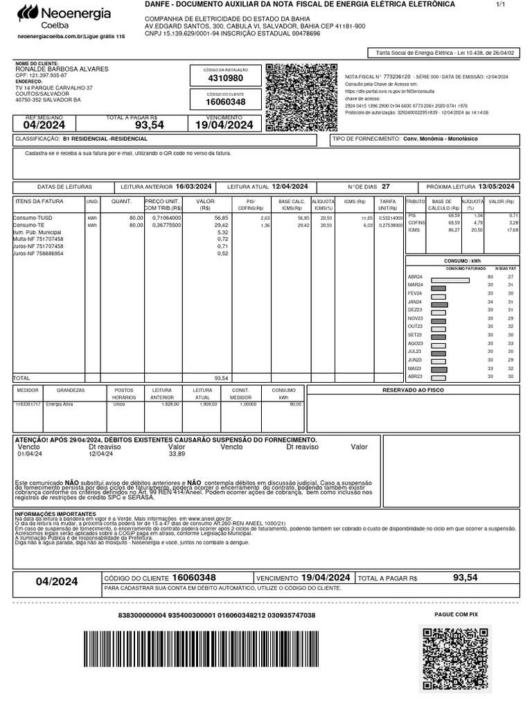 CÓDIGO DO CLIENTE 16060348 VENCIMENTO 19/04/2024 TOTAL A PAGAR R$ 93,54