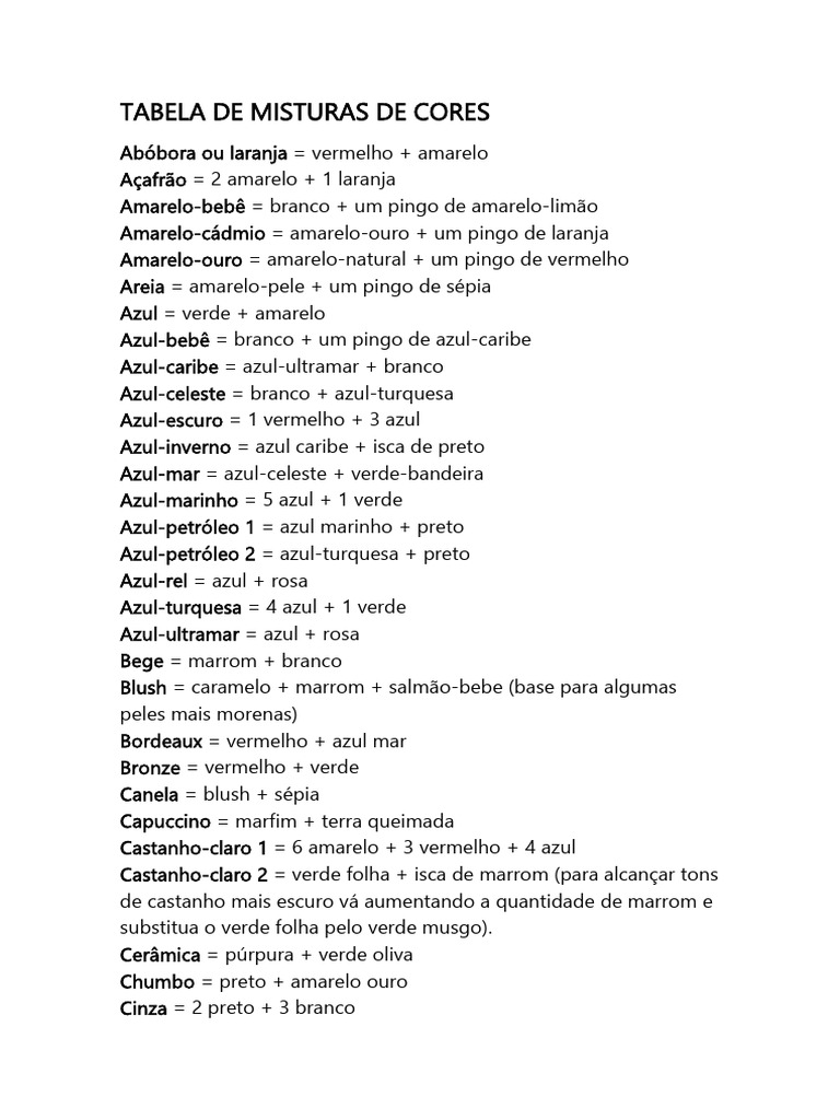TABELA DE MISTURAS DE CORES