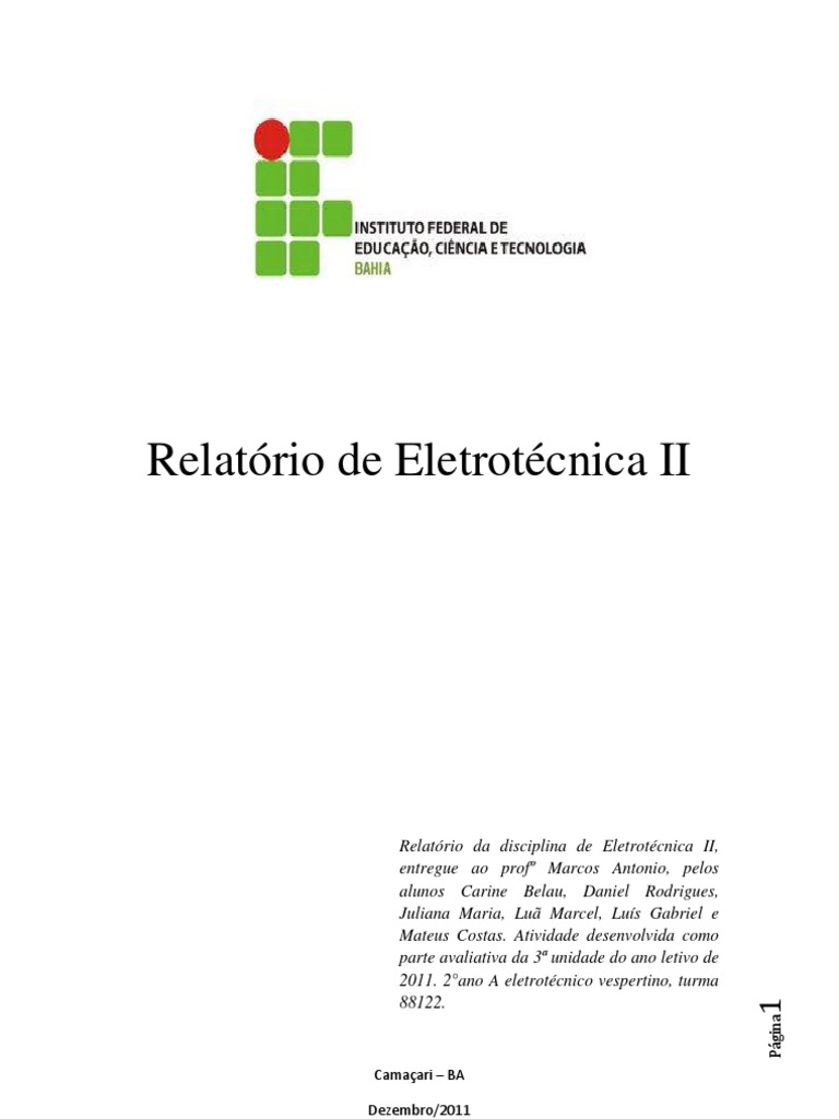Relatrio da disciplina de Eletrotcnica II, entregue ao prof Marcos Antonio, pelos alunos Carine Belau, Daniel Rodrigues, Juliana Maria, Lu Marcel, Lus Gabriel e Mateus Costas. Atividade desenvolvida como parte avaliativa da 3 unidade do ano letivo de 2011. 2ano A eletrotcnico vespertino, turma 88122.