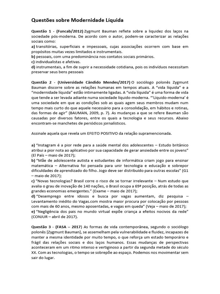 Questões sobre Modernidade Líquida