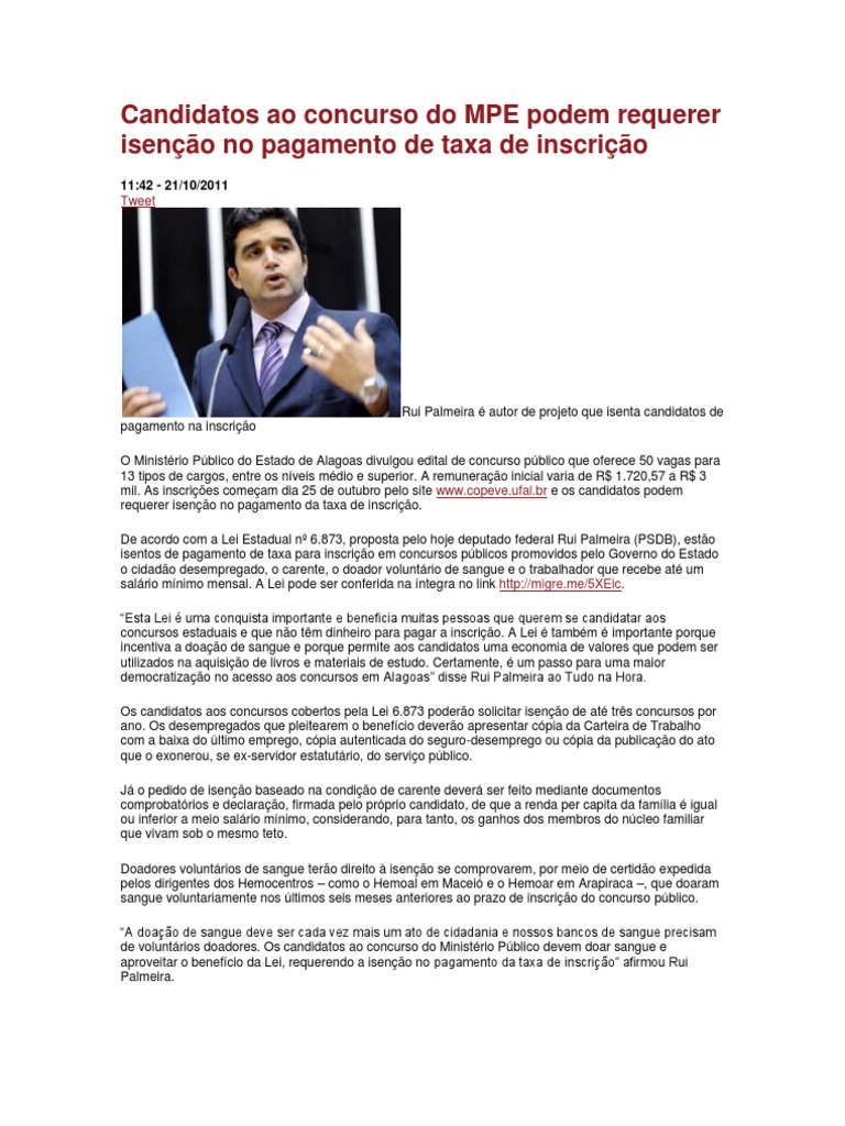 Rui Palmeira autor de projeto que isenta candidatos de pagamento na inscrio O Ministrio Pblico do Estado de Alagoas divulgou edital de concurso pblico que oferece 50 vagas para 13 tipos de cargos, entre os nveis mdio e superior. A remunerao inicial varia de R$ 1.720,57 a R$ 3 mil. As inscries comeam dia 25 de outubro pelo site www.copeve.ufal.br e os candidatos podem requerer iseno no pagamento da taxa de inscrio. De acordo com a Lei Estadual n 6.873, proposta pelo hoje deputado federal Rui Palmeira (PSDB), esto isentos de pagamento de taxa para inscrio em concursos pblicos promovidos pelo Governo do Estado o cidado desempregado, o carente, o doador voluntrio de sangue e o trabalhador que recebe at um salrio mnimo mensal. A Lei pode ser conferida na ntegra no link http://migre.me/5XEic. Esta Lei uma conquista importante e beneficia muitas pessoas que querem se candidatar aos concursos estaduais e que no tm dinheiro para pagar a inscrio. A Lei tambm importante porque incentiva a doao de sangue e porque permite aos candidatos uma economia de valores que podem ser utilizados na aquisio de livros e materiais de estudo. Certamente, um passo para uma maior democratizao no acesso aos concursos em Alagoas disse Rui Palmeira ao Tudo na Hora. Os candidatos aos concursos cobertos pela Lei 6.873 podero solicitar iseno de at trs concursos por ano. Os desempregados que pleitearem o benefcio devero apresentar cpia da Carteira de Trabalho com a baixa do ltimo emprego, cpia autenticada do seguro-desemprego ou cpia da publicao do ato que o exonerou, se ex-servidor estatutrio, do servio pblico. J o pedido de iseno baseado na condio de carente dever ser feito mediante documentos comprobatrios e declarao, firmada pelo prprio candidato, de que a renda per capita da famlia igual ou inferior a meio salrio mnimo, considerando, para tanto, os ganhos dos membros do ncleo familiar que vivam sob o mesmo teto. Doadores voluntrios de sangue tero direito iseno se comprovarem, por meio de certido expedida pelos dirigentes dos Hemocentros como o Hemoal em Macei e o Hemoar em Arapiraca , que doaram sangue voluntariamente nos ltimos seis meses anteriores ao prazo de inscrio do concurso pblico. A doao de sangue deve ser cada vez mais um ato de cidadania e nossos bancos de sangue precisam de voluntrios doadores. Os candidatos ao concurso do Ministrio Pblico devem doar sangue e aproveitar o benefcio da Lei, requerendo a iseno no pagamento da taxa de inscrio afirmou Rui Palmeira.