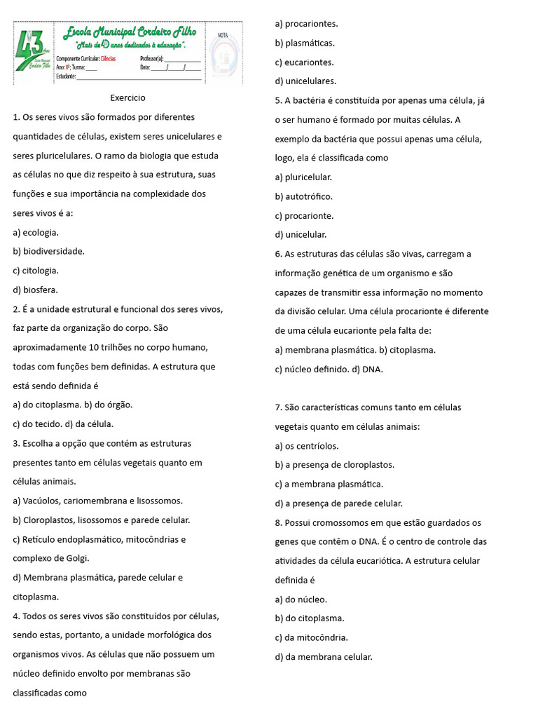 a) do citoplasma. b) do órgão. 7. São características comuns tanto em células