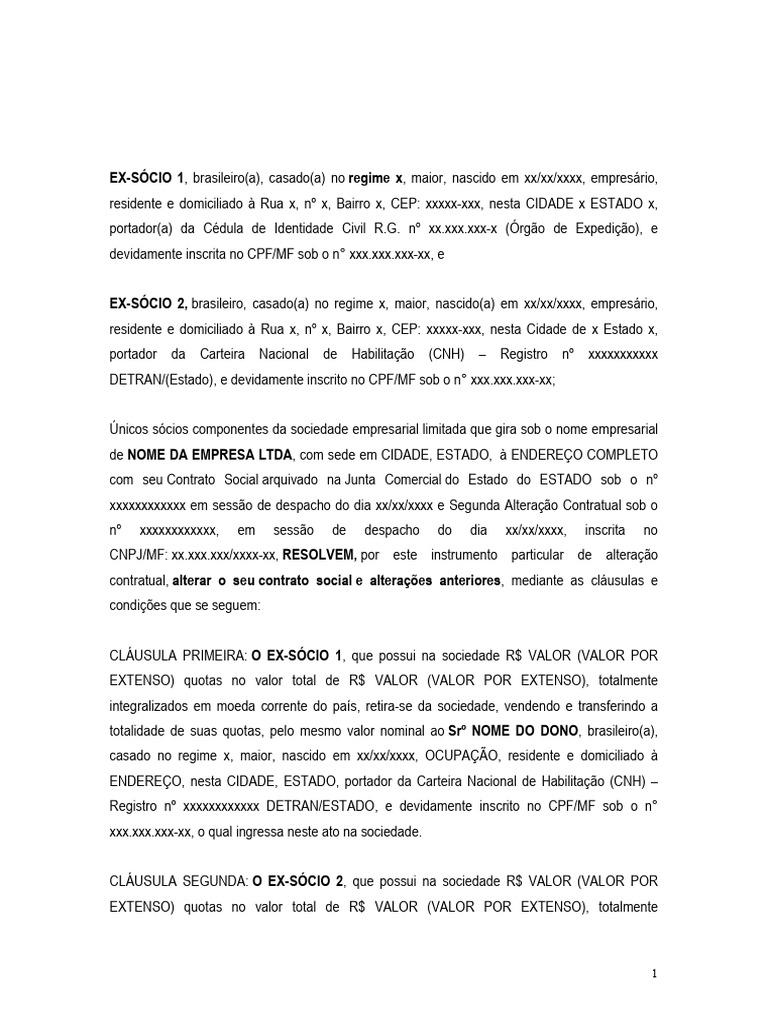 totalidade de suas quotas, pelo mesmo valor nominal ao Srº NOME DO DONO, brasileiro(a),