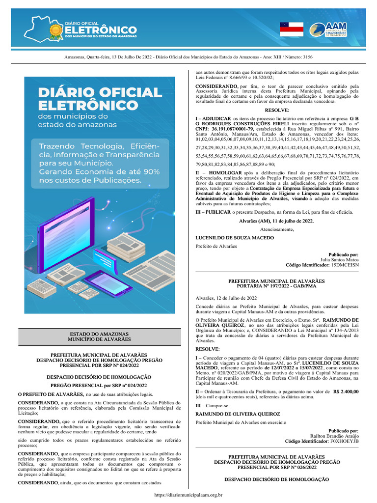 Amazonas, Quarta-feira, 13 De Julho De 2022 - Diário Oficial dos Municípios do Estado do Amazonas - Ano: XIII / Número: 3156