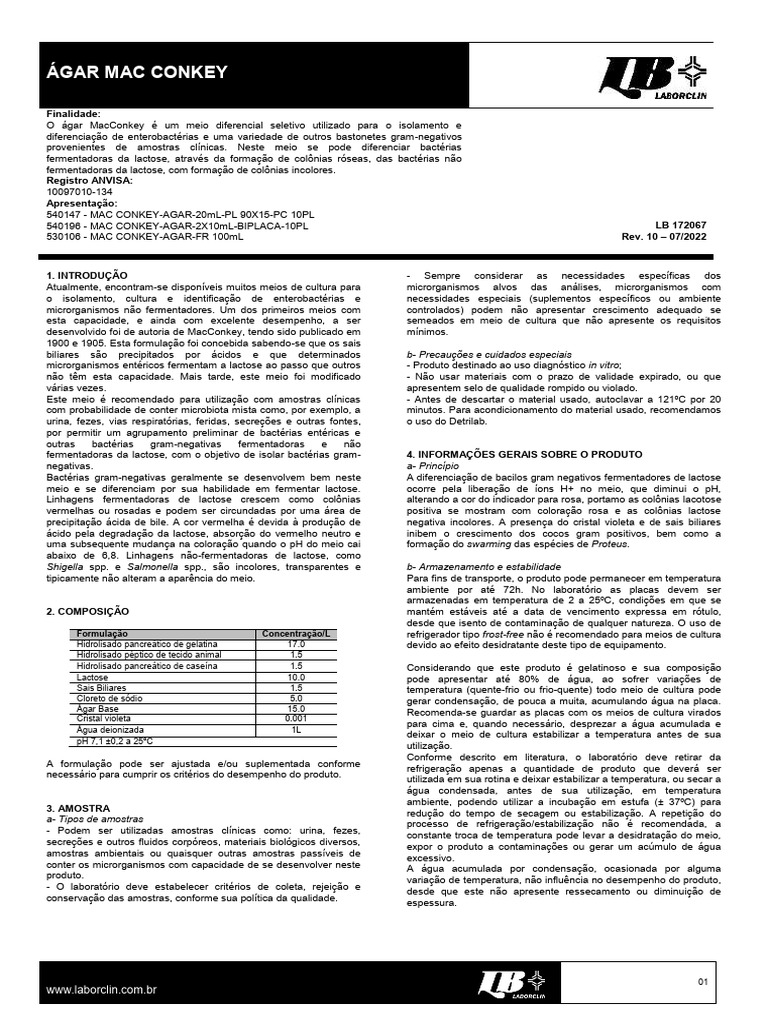 microrganismos entéricos fermentam a lactose ao passo que outros - Produto destinado ao uso diagnóstico in vitro;