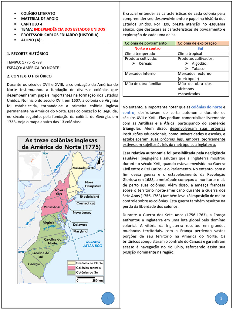 TEMA: INDEPENDÊNCIA DOS ESTADOS UNIDOS abaixo, que destacará as características de povoamento e