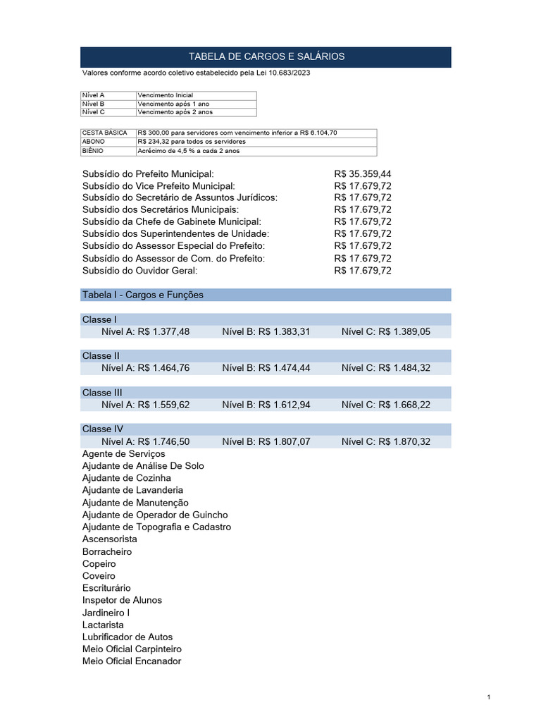 Nível A: R$ 1.961,50 Nível B: R$ 2.030,97 Nível C: R$ 2.102,83