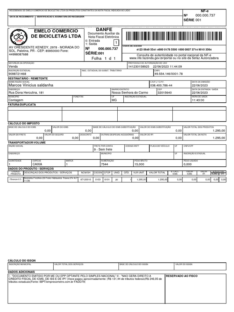 DE BICICLETAS LTDA Nota Fiscal Eletrônica