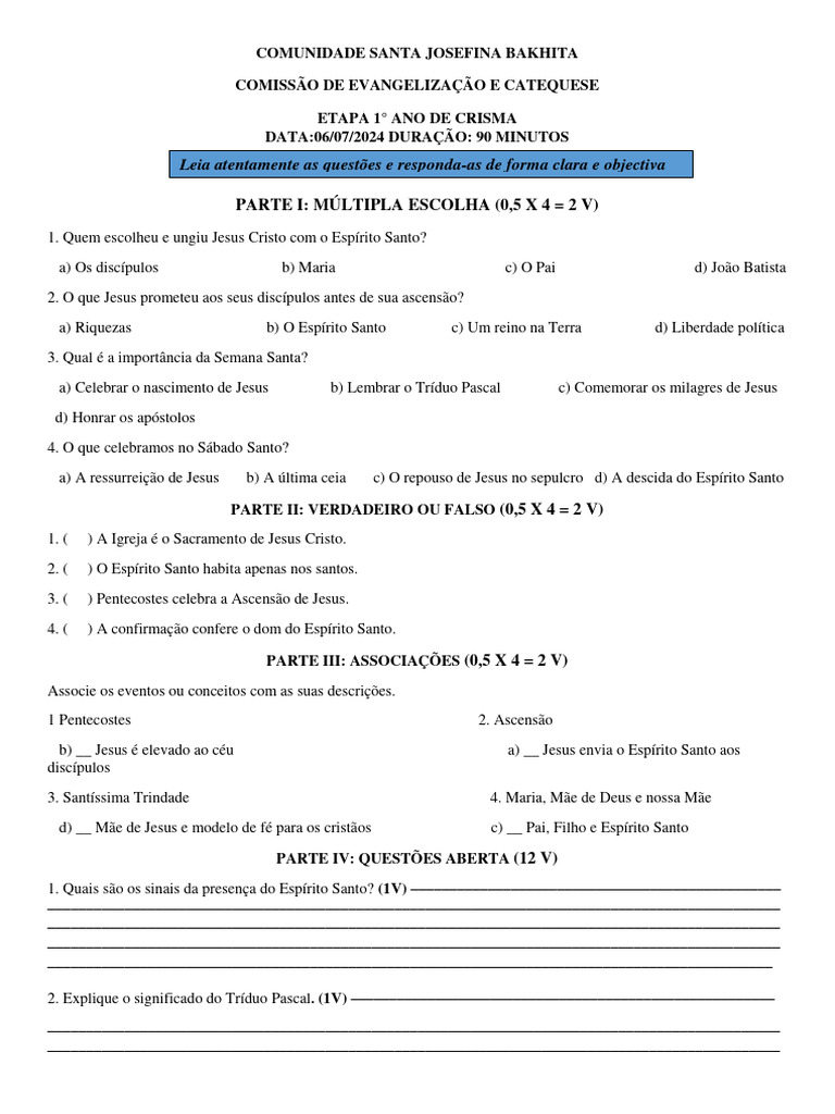 d) __ Mãe de Jesus e modelo de fé para os cristãos c) __ Pai, Filho e Espírito Santo