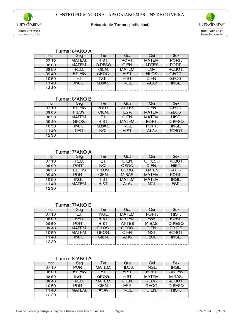 Horário escolar gerado pelo programa Urânia ([Link]) Página: 1 17/07/2024 (09:27)