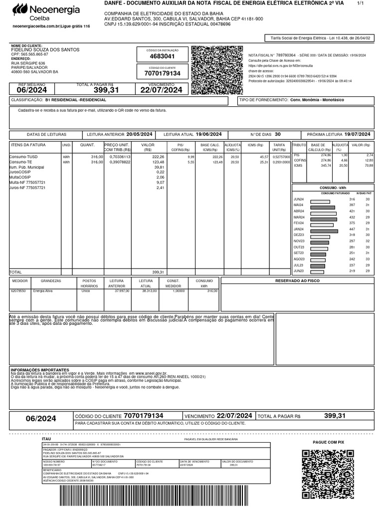 CÓDIGO DO CLIENTE 7070179134 VENCIMENTO 22/07/2024 TOTAL A PAGAR R$ 399,31