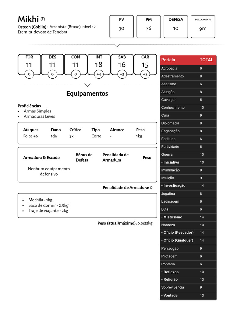 Osteon (Goblin)- Arcanista (Bruxo) nível 12 30 76 10 9m