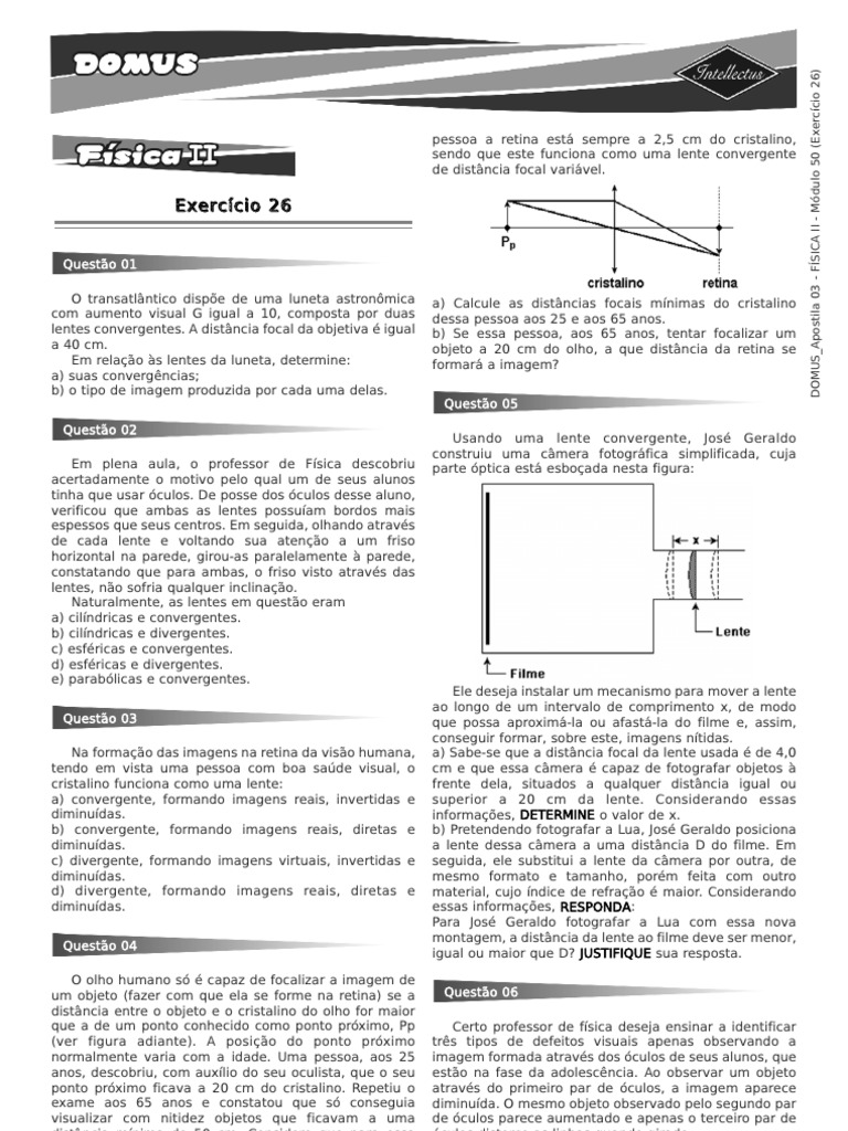 Questo 01 O transatlntico dispe de uma luneta astronmica com aumento visual G igual a 10, composta por duas lentes convergentes. A distncia focal da objetiva igual a 40 cm. Em relao s lentes da luneta, determine: a) suas convergncias; b) o tipo de imagem produzida por cada uma delas. Questo 02 Em plena aula, o professor de Fsica descobriu acertadamente o motivo pelo qual um de seus alunos tinha que usar culos. De posse dos culos desse aluno, verificou que ambas as lentes possuam bordos mais espessos que seus centros. Em seguida, olhando atravs de cada lente e voltando sua ateno a um friso horizontal na parede, girou-as paralelamente parede, constatando que para ambas, o friso visto atravs das lentes, no sofria qualquer inclinao. Naturalmente, as lentes em questo eram a) cilndricas e convergentes. b) cilndricas e divergentes. c) esfricas e convergentes. d) esfricas e divergentes. e) parablicas e convergentes. Questo 03 Na formao das imagens na retina da viso humana, tendo em vista uma pessoa com boa sade visual, o cristalino funciona como uma lente: a) convergente, formando imagens reais, invertidas e diminudas. b) convergente, formando imagens reais, diretas e diminudas. c) divergente, formando imagens virtuais, invertidas e diminudas. d) divergente, formando imagens reais, diretas e diminudas. Questo 04 O olho humano s capaz de focalizar a imagem de um objeto (fazer com que ela se forme na retina) se a distncia entre o objeto e o cristalino do olho for maior que a de um ponto conhecido como ponto prximo, Pp (ver figura adiante). A posio do ponto prximo normalmente varia com a idade. Uma pessoa, aos 25 anos, descobriu, com auxlio do seu oculista, que o seu ponto prximo ficava a 20 cm do cristalino. Repetiu o exame aos 65 anos e constatou que s conseguia visualizar com nitidez objetos que ficavam a uma distncia mnima de 50 cm. Considere que para essa