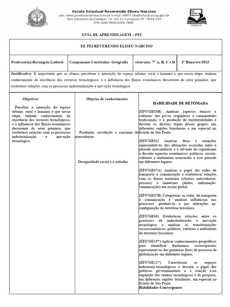 Professor(a):Rosangela Ladário Componente Curricular: Geografia série/ano: 7° A, B, C e D 3º Bimestre/2023