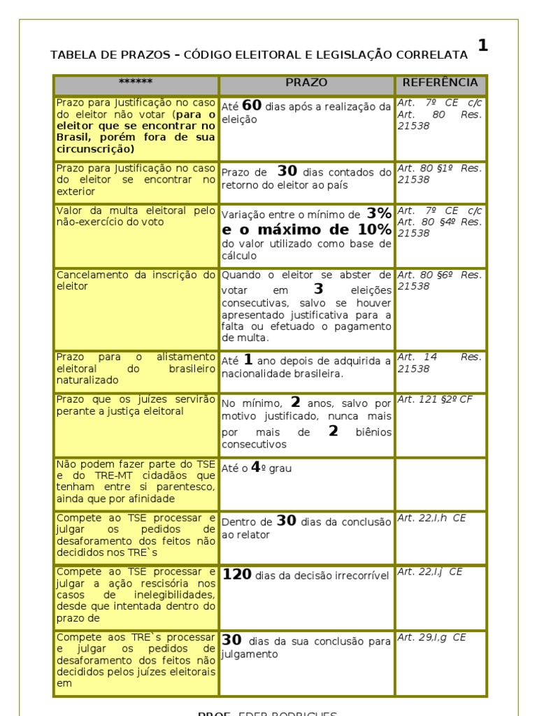 TABELA DE PRAZOS CDIGO ELEITORAL E LEGISLAO CORRELATA
