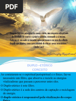 Para que o corpo fsico (matria densa) receba estmulos dos corpos menos densos (corpos sutis) preciso acoplar a matria densa com a sutil. Esse acoplamento realizado atravs de um corpo chamado duplo etrico cuja funo mais importante transmitir para a tela do crebro todas as vibraes das emoes e impulsos que o perisprito recebe da alma expressando as qualidades prprias de cada indivduo. Absorver a vitalidade (prana) emanada do Sol, misturando-a com as vrias energias vitalizantes do planeta e distribuindo-as ao soma. Seu automatismo instintivo e biolgico, no inteligente. O Duplo Etrico constitudo por ectoplasma cuja base o fluido csmico universal emanado do prprio planeta Terra. pea fundamental nos efeitos fsicos e acoplamento medinico e pode ser afetado por substncias cidas, hipnticas, sedativas ou entorpecentes. As criaturas dotadas de mediunidade devem ter o mximo cuidado evitando alimentos ou bebidas com as caractersticas acima descritas. Pode ser afastado do corpo por pequena distncia, atravs de anestesia, transe medinico, sono, coma alcolico ou mesmo hipnotismo, mas tende sempre a reintegrao. Quando h o desencarne do ser o Duplo Etrico drena para o corpo inerte, as energias negativas residuais, retirando do esprito recm liberto as sobrecargas desnecessrias. Aps a drenagem o Duplo Etrico entra em processo de desintegrao e esse fenmeno, passvel de ser observado conhecido por fogo-ftuo.