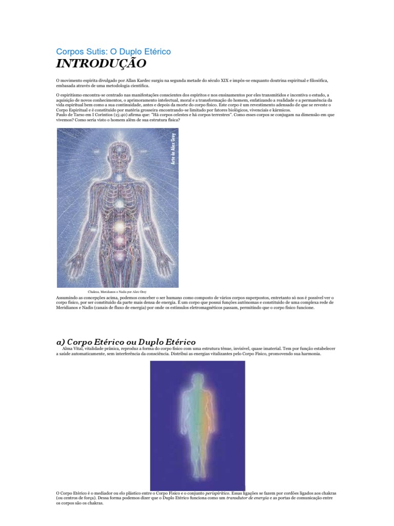 O movimento esprita divulgado por Allan Kardec surgiu na segunda metade do sculo XIX e imps-se enquanto doutrina espiritual e filosfica, embasada atravs de uma metodologia cientfica. O espiritismo encontra-se centrado nas manifestaes conscientes dos espritos e nos ensinamentos por eles transmitidos e incentiva o estudo, a aquisio de novos conhecimentos, o aprimoramento intelectual, moral e a transformao do homem, enfatizando a realidade e a permanncia da vida espiritual bem como a sua continuidade, antes e depois da morte do corpo fsico. Este corpo um revestimento adensado de que se reveste o Corpo Espiritual e constitudo por matria grosseira encontrando-se limitado por fatores biolgicos, vivenciais e krmicos. Paulo de Tarso em I Corntios (15:40) afirma que: "H corpos celestes e h corpos terrestres". Como esses corpos se conjugam na dimenso em que vivemos? Como seria visto o homem alm de sua estrutura fsica?