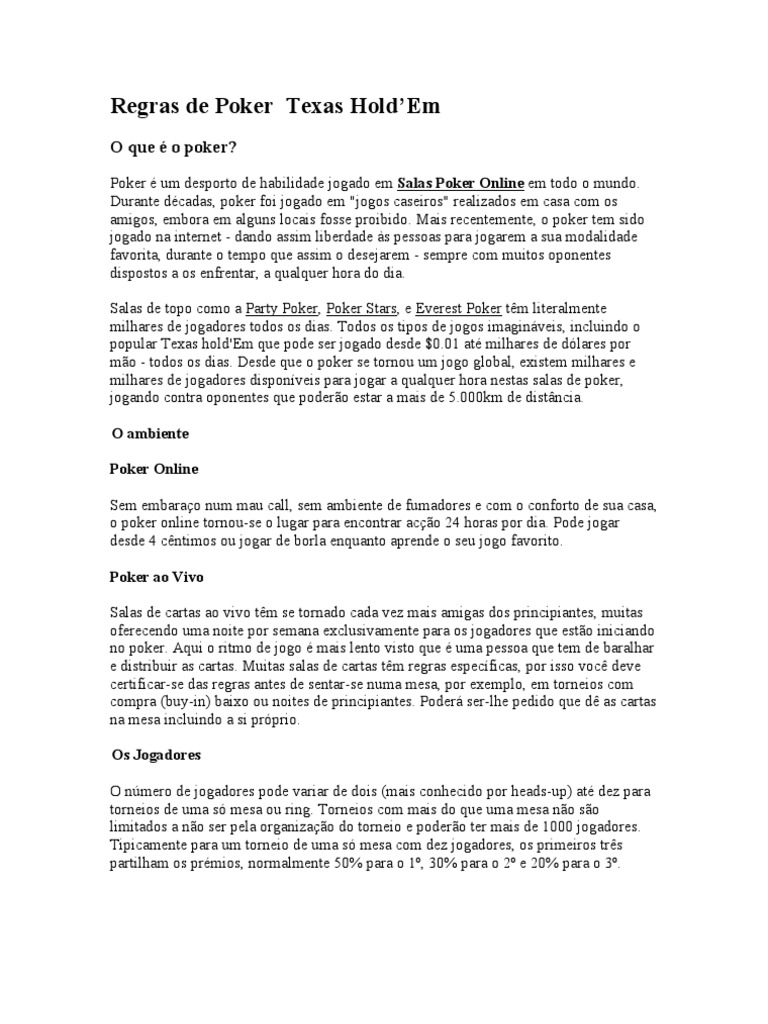 Poker um desporto de habilidade jogado em Salas Poker Online em todo o mundo. Durante dcadas, poker foi jogado em "jogos caseiros" realizados em casa com os amigos, embora em alguns locais fosse proibido. Mais recentemente, o poker tem sido jogado na internet - dando assim liberdade s pessoas para jogarem a sua modalidade favorita, durante o tempo que assim o desejarem - sempre com muitos oponentes dispostos a os enfrentar, a qualquer hora do dia. Salas de topo como a Party Poker, Poker Stars, e Everest Poker tm literalmente milhares de jogadores todos os dias. Todos os tipos de jogos imaginveis, incluindo o popular Texas hold'Em que pode ser jogado desde $0.01 at milhares de dlares por mo - todos os dias. Desde que o poker se tornou um jogo global, existem milhares e milhares de jogadores disponveis para jogar a qualquer hora nestas salas de poker, jogando contra oponentes que podero estar a mais de 5.000km de distncia. O ambiente Poker Online Sem embarao num mau call, sem ambiente de fumadores e com o conforto de sua casa, o poker online tornou-se o lugar para encontrar aco 24 horas por dia. Pode jogar desde 4 cntimos ou jogar de borla enquanto aprende o seu jogo favorito. Poker ao Vivo Salas de cartas ao vivo tm se tornado cada vez mais amigas dos principiantes, muitas oferecendo uma noite por semana exclusivamente para os jogadores que esto iniciando no poker. Aqui o ritmo de jogo mais lento visto que uma pessoa que tem de baralhar e distribuir as cartas. Muitas salas de cartas tm regras especficas, por isso voc deve certificar-se das regras antes de sentar-se numa mesa, por exemplo, em torneios com compra (buy-in) baixo ou noites de principiantes. Poder ser-lhe pedido que d as cartas na mesa incluindo a si prprio. Os Jogadores O nmero de jogadores pode variar de dois (mais conhecido por heads-up) at dez para torneios de uma s mesa ou ring. Torneios com mais do que uma mesa no so limitados a no ser pela organizao do torneio e podero ter mais de 1000 jogadores. Tipicamente para um torneio de uma s mesa com dez jogadores, os primeiros trs partilham os prmios, normalmente 50% para o 1, 30% para o 2 e 20% para o 3.