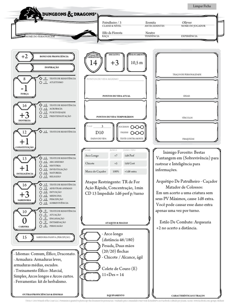 TM & © 2014 Wizards of the Coast LLC. Permission is granted to photocopy this document for personal use. Traduzido pela Comunidade D&D Next da RedeRPG no Facebook e editado por JZanin. Acesse: [Link]/groups/dednext
