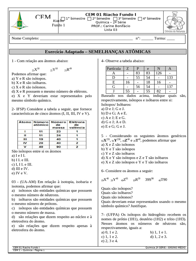 Exercício Adaptado – SEMELHANÇAS ATÔMICAS