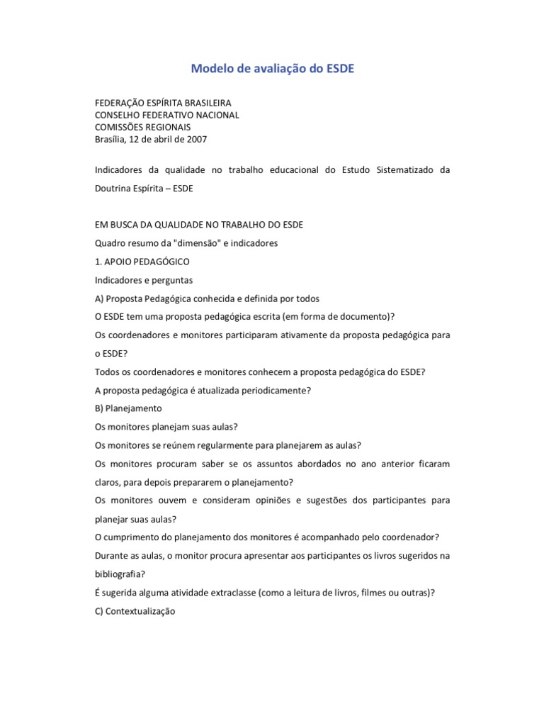 monitores e participantes do ESDE? Os coordenadores de equipes conseguem demonstrar aos participantes que a motivação é uma força interior e que todos podem desenvolvê-la? CONSENSO: _______________________________________________________________________ ______________________________________________________ C) Respeito à individualidade Os participantes do ESDE tratam bem os coordenadores / monitores e demais colaboradores da Casa Espírita? Os coordenadores/monitores respeitam e tratam bem os participantes do ESDE e os demais colaboradores da Casa Espírita? Os colaboradores da Casa Espírita se sentem respeitados e valorizados pelos coordenadores/monitores e participantes do ESDE? Os participantes que chegam para se matricular no ESDE ou pedir informações são atendidos com atenção e respeito? CONSENSO: _______________________________________________________________________ ______________________________________________________ D) Disciplina Os participantes são pontuais e assíduos? Existe controle de freqüência dos alunos? Os participantes do ESDE são esclarecidos quantos às normas de funcionamento e regras de convivência dentro da Casa Espírita? CONSENSO: _______________________________________________________________________ ______________________________________________________ 3 . AMBIENTE FÍSICO Indicadores e perguntas A) Material didático .A Casa Espírita promove eventos de confraternizações e conta com a presença dos coordenadores.