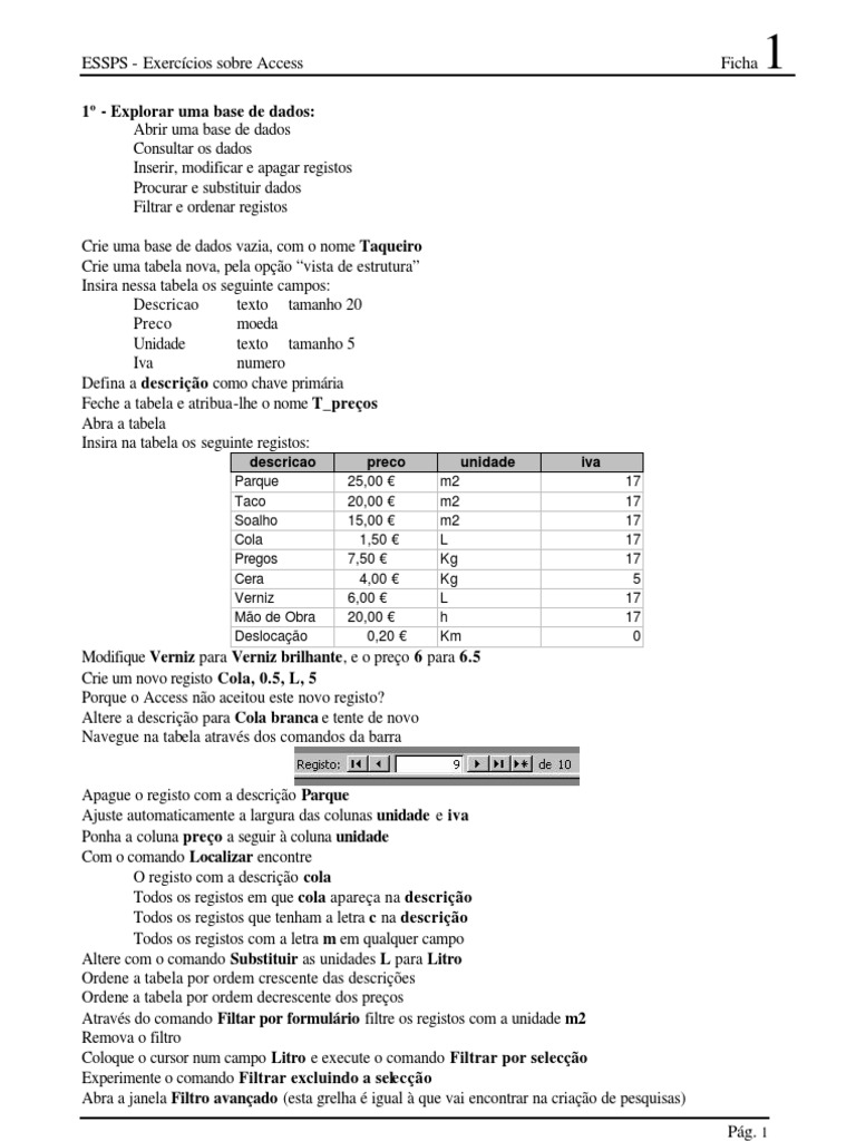 1 - Explorar uma base de dados: Abrir uma base de dados Consultar os dados Inserir, modificar e apagar registos Procurar e substituir dados Filtrar e ordenar registos Crie uma base de dados vazia, com o nome Taqueiro Crie uma tabela nova, pela opo vista de estrutura Insira nessa tabela os seguinte campos: Descricao texto tamanho 20 Preco moeda Unidade texto tamanho 5 Iva numero Defina a descrio como chave primria Feche a tabela e atribua-lhe o nome T_preos Abra a tabela Insira na tabela os seguinte registos: