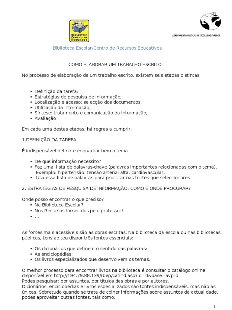 Em cada uma destas etapas, h regras a cumprir. 1.DEFINIO DA TAREFA indispensvel definir e enquadrar bem o tema. De que informao necessito? Faz uma lista de palavras-chave (palavras importantes relacionadas com o tema). Exemplo: hipertenso, tenso arterial alta, cardiovascular. Usa essa lista de palavras para procurar nas fontes que seleccionares. 2. ESTRATGIAS DE PESQUISA DE INFORMAO: COMO E ONDE PROCURAR? Onde posso encontrar o que preciso? Na Biblioteca Escolar? Nos Recursos fornecidos pelo professor?